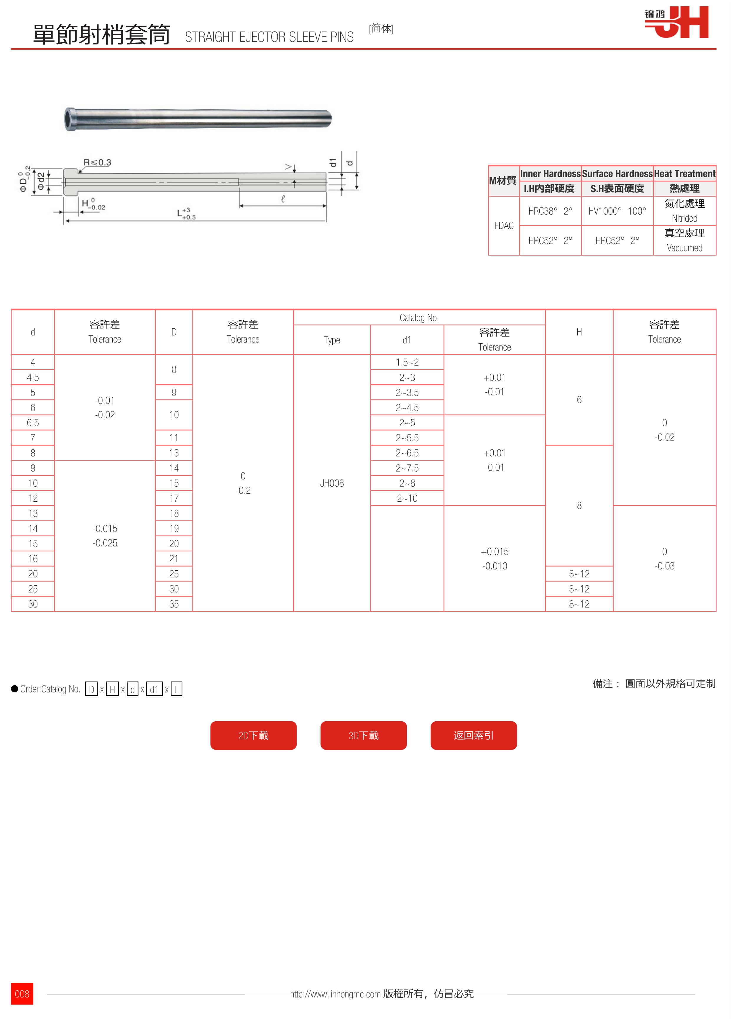 | 4 | -0.01 -0.02 | 8 | 0 -0.2 | JH008 | 1.5~2 | +0.01 -0.01 | 6 | 0 -0.02 |
