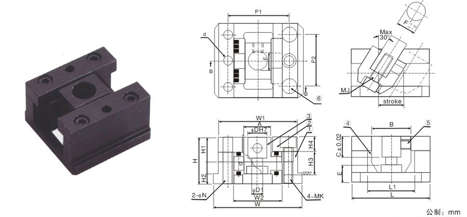 | Type.NO | D | d | D1 | A | B | C | E | F | MJ | H | H1 | H2 | H3 | H4 | L | L1 | W | W1 | W2 | P1 | P2 | MK | ΦN | Stroke |