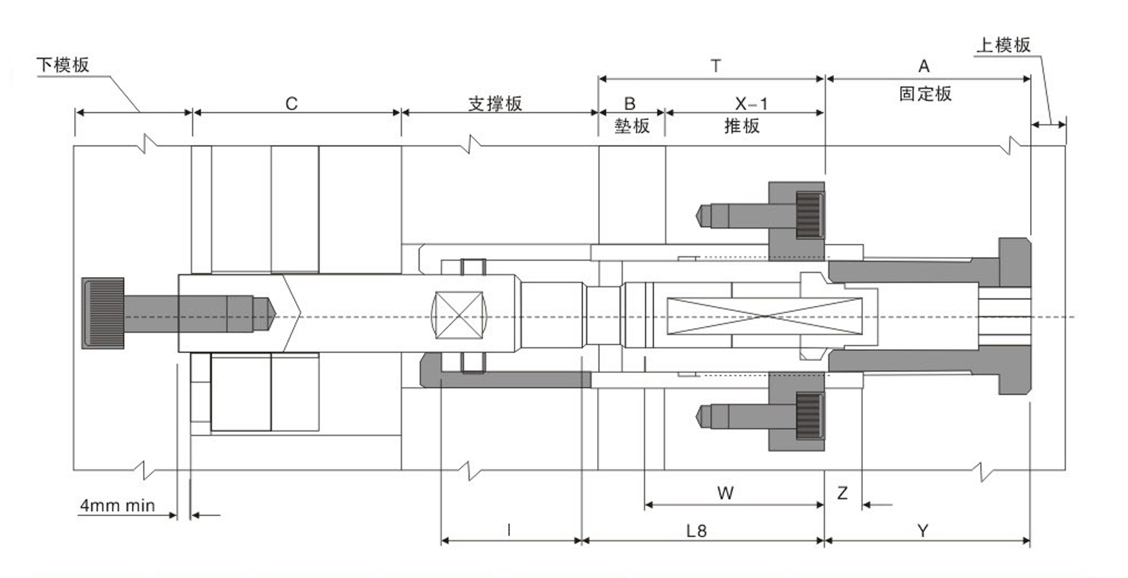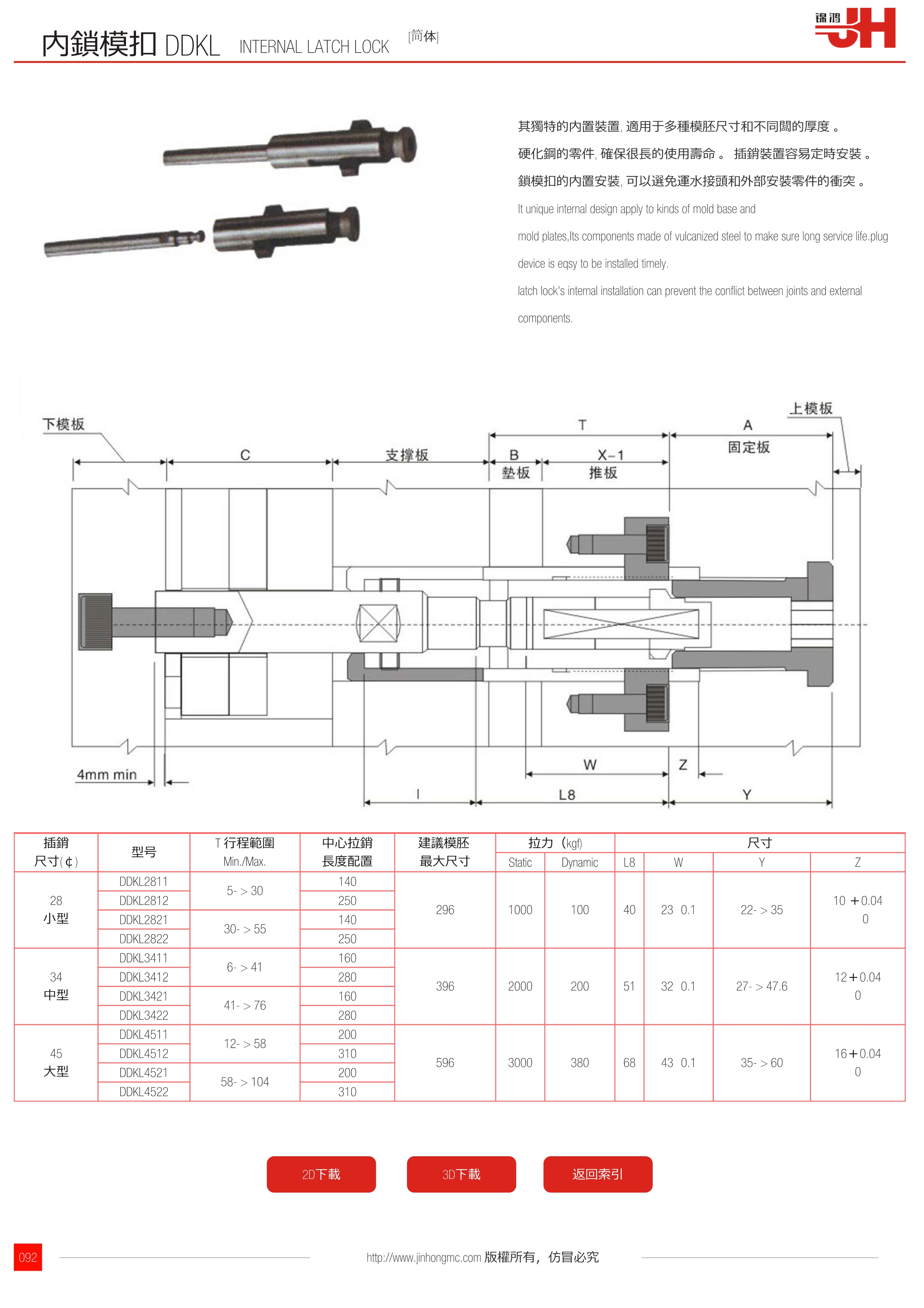 | 插銷 尺寸(¢) | 型號 | T 行程范圍 Min./Max. | 中心拉銷 長度配置 | 建議模胚 最大尺寸 | 拉力(kgf) | 尺寸 | ||||