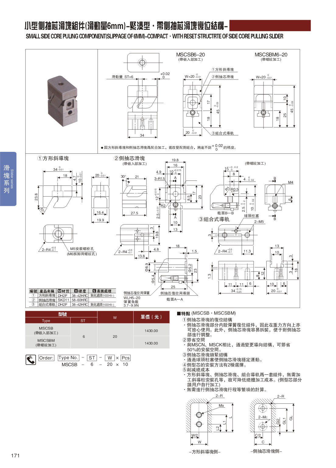 訂購:171-小型側(cè)抽芯滑塊組件(滑動量6mm)-緊湊型˙帶側(cè)抽芯滑塊復(fù)位結(jié)構(gòu) MSCSB