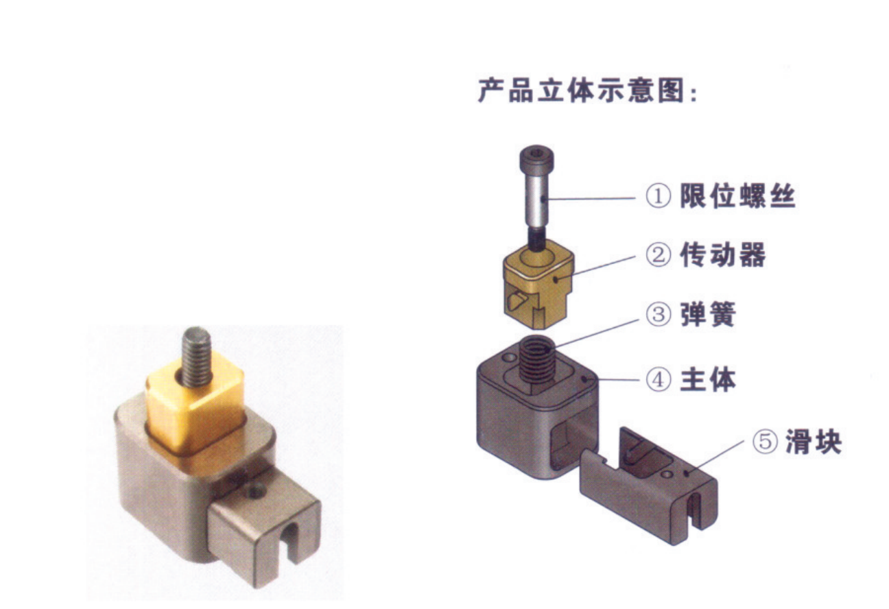 2.主體、滑塊、傳動(dòng)器、限位螺絲、彈簧為一套組件,無(wú)需加工斜導(dǎo)柱孔及 一些繁鎖加工,因此可以降低加工成本及加工時(shí)間。