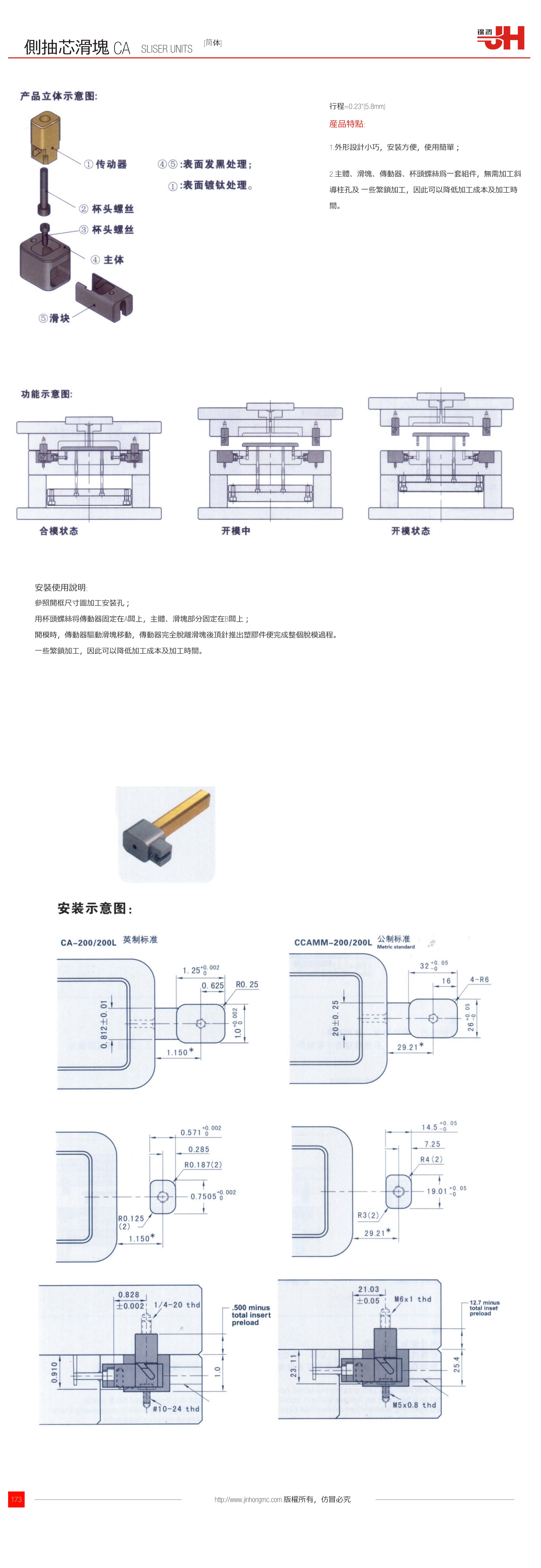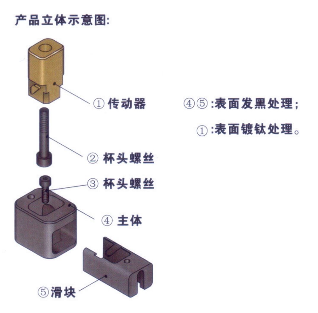 2.主體、滑塊、傳動(dòng)器、杯頭螺絲為一套組件,無需加工斜導(dǎo)柱孔及 一些繁鎖加工,因此可以降低加工成本及加工時(shí)間。