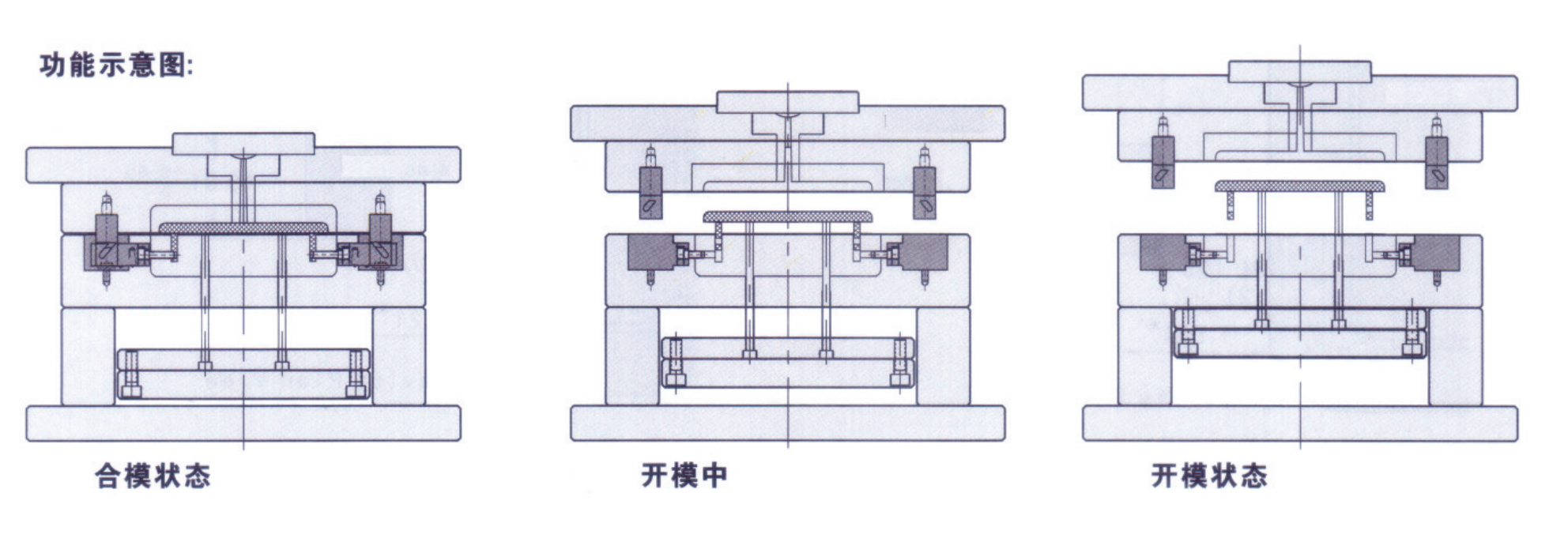 開模時(shí),傳動(dòng)器驅(qū)動(dòng)滑塊移動(dòng),傳動(dòng)器完全脫離滑塊后頂針推出塑膠件便完成整個(gè)脫模過程。
