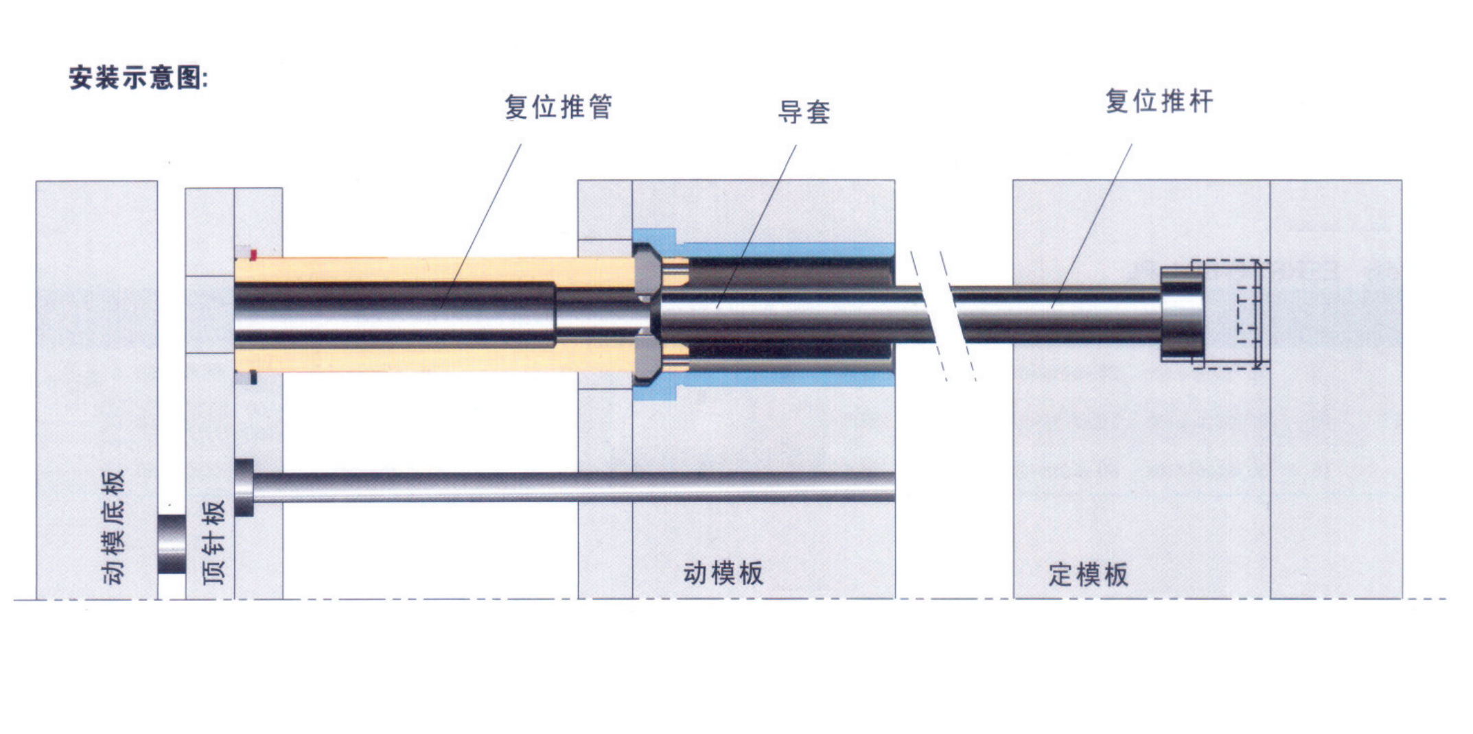 將復位推管安裝到頂針板上,導套安裝到動模板上,復位推桿固定在定模板上