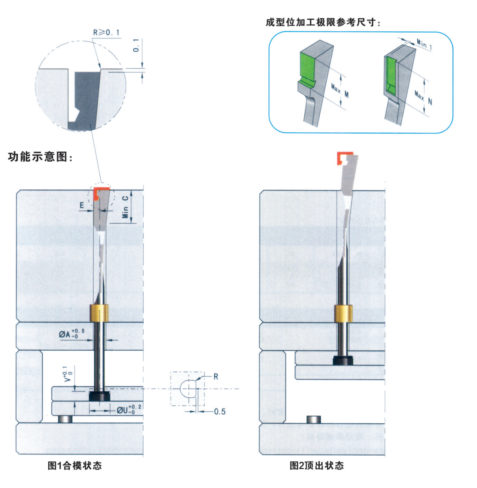 2. 彈弓頂針斜度面(即膠位背面)與型芯完全貼合(即保證貼合長度C值);