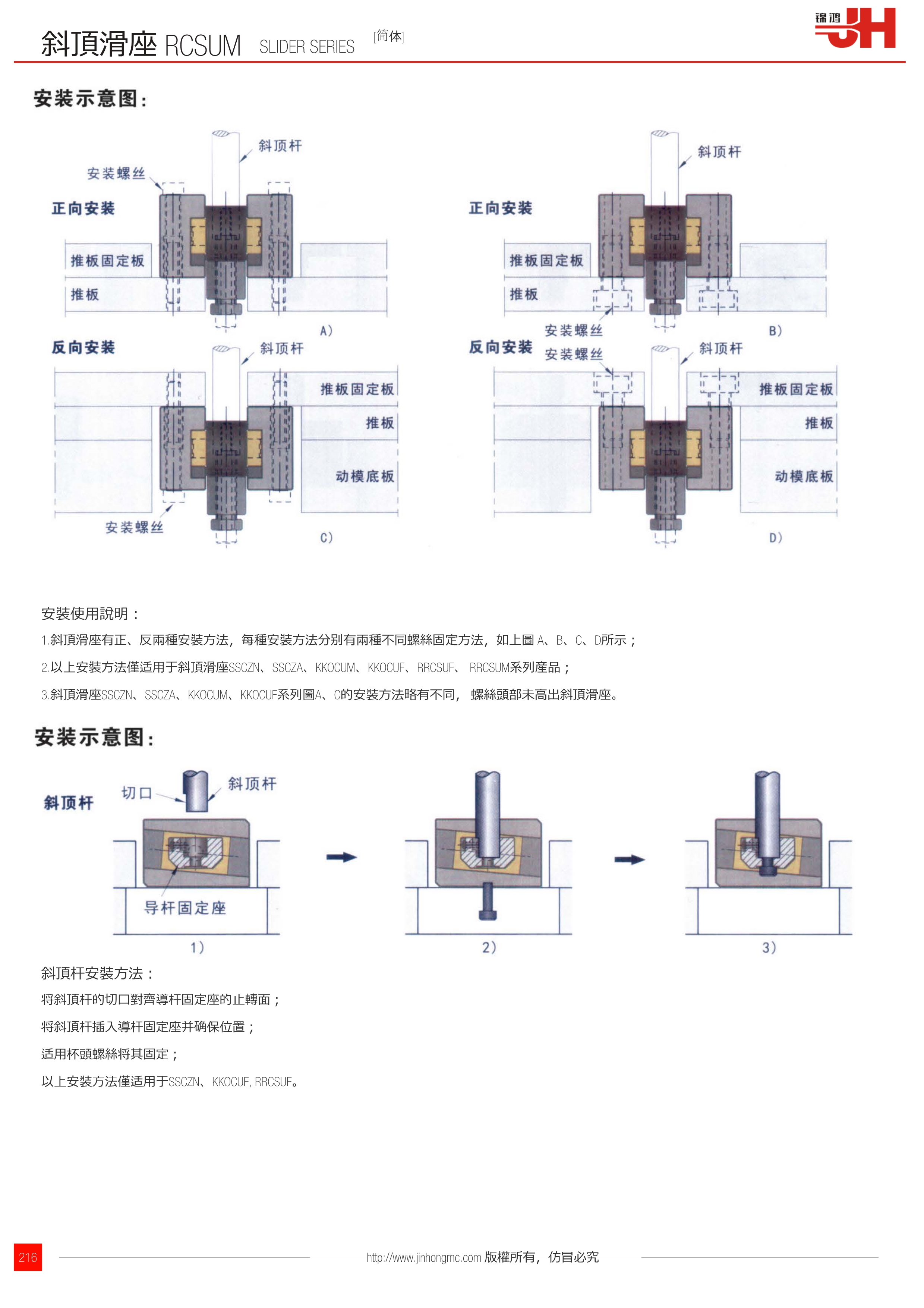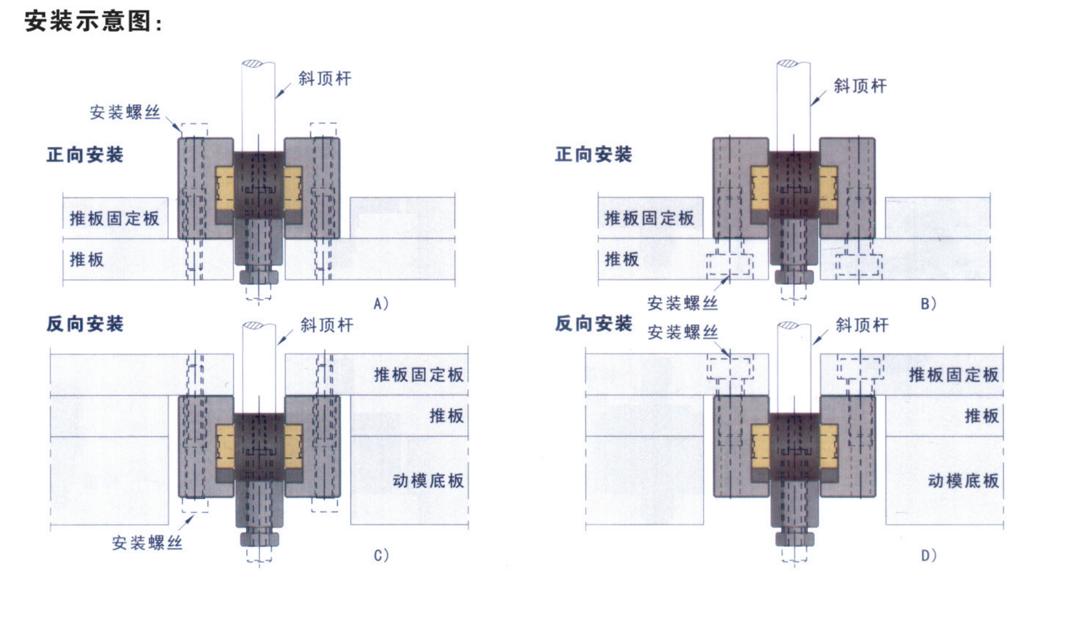1.斜頂滑座有正、反兩種安裝方法,每種安裝方法分別有兩種不同螺絲固定方法,如上圖 A、B、C、D所示;