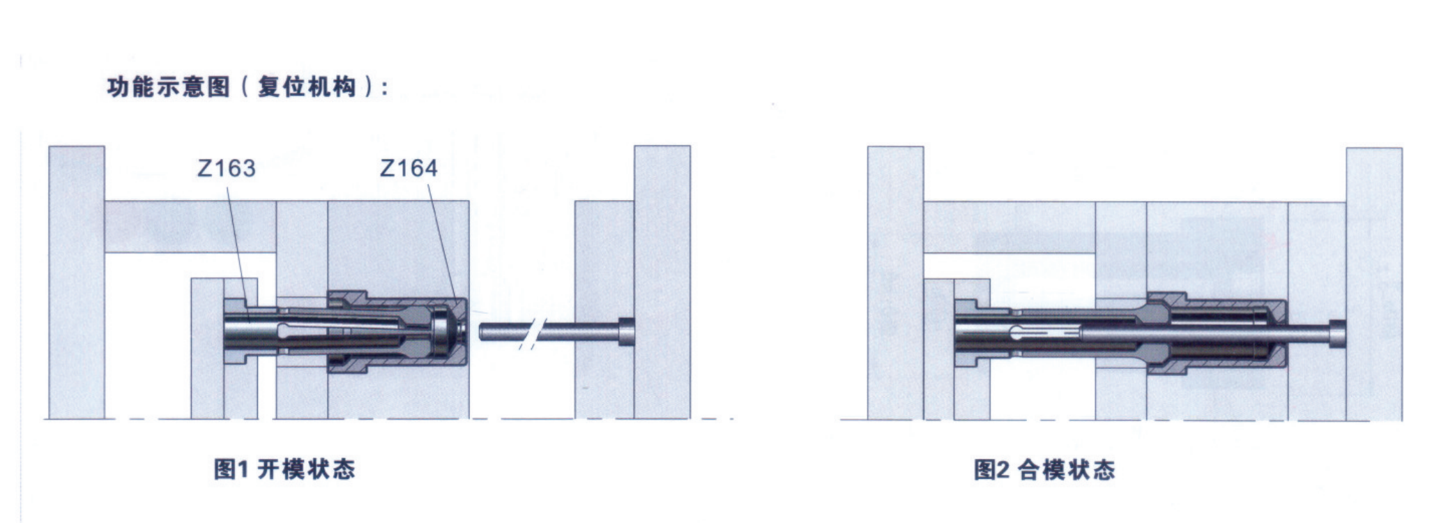 Z163與Z164需配合使用,外加一支頂針,即可實(shí)現(xiàn)復(fù)位或二次頂出機(jī)構(gòu)功能