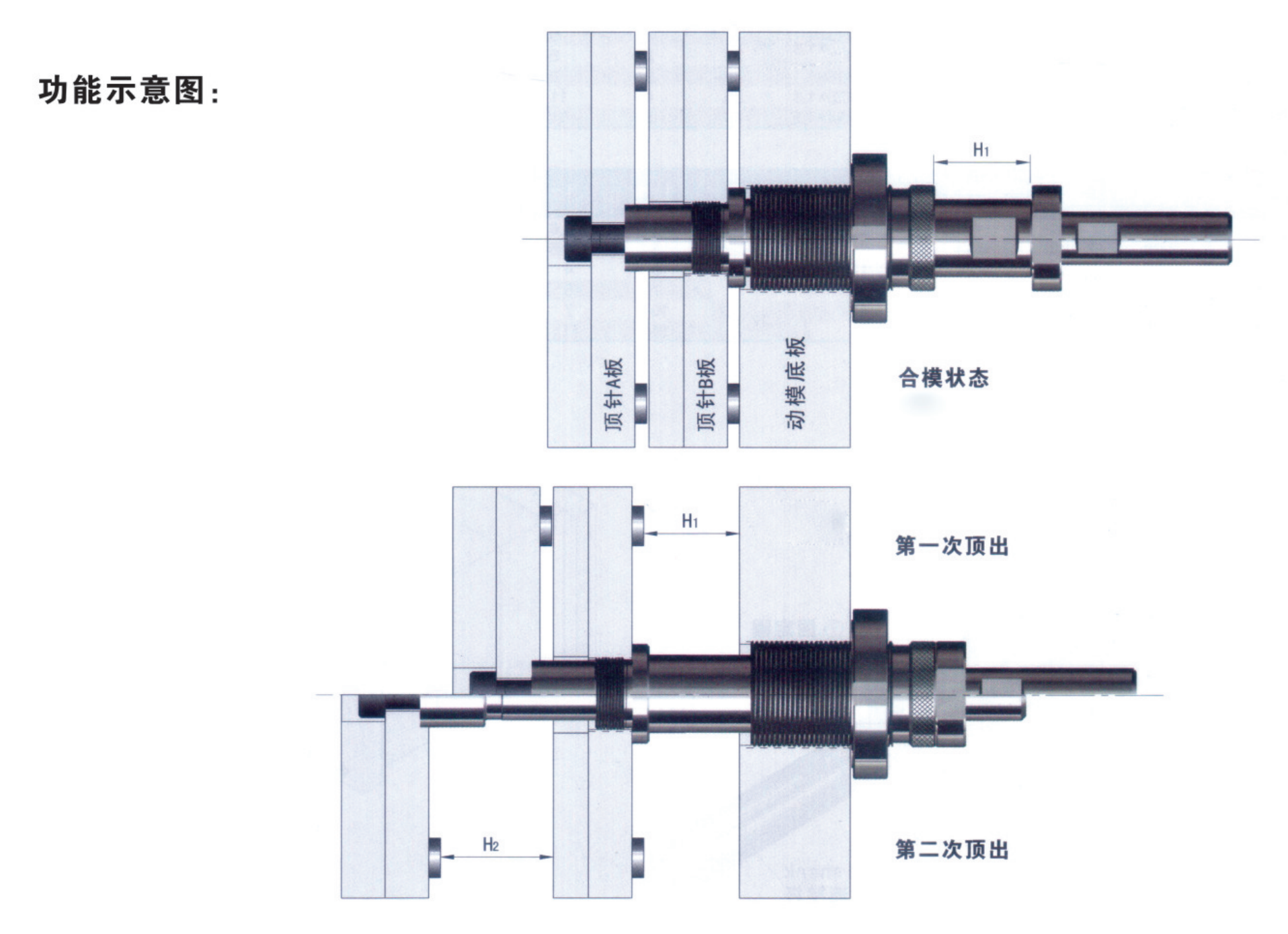 旋轉(zhuǎn)外牙套,調(diào)節(jié)外牙套與底板(法蘭)的相對(duì)位置即可在規(guī)定的范圍內(nèi)設(shè)定第 一次頂出行程“H1” 的位置,設(shè)定后再將外卡環(huán)緊固;