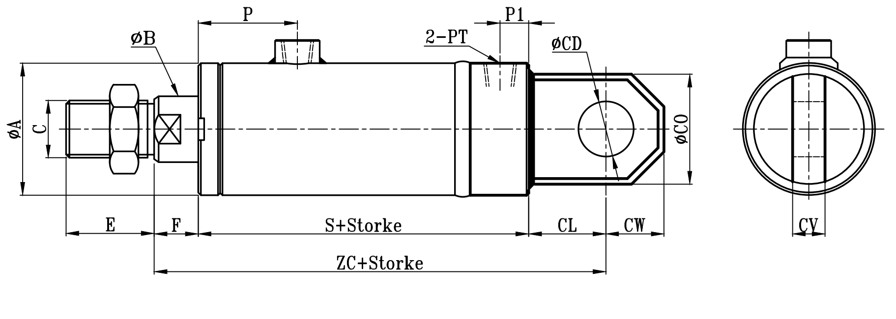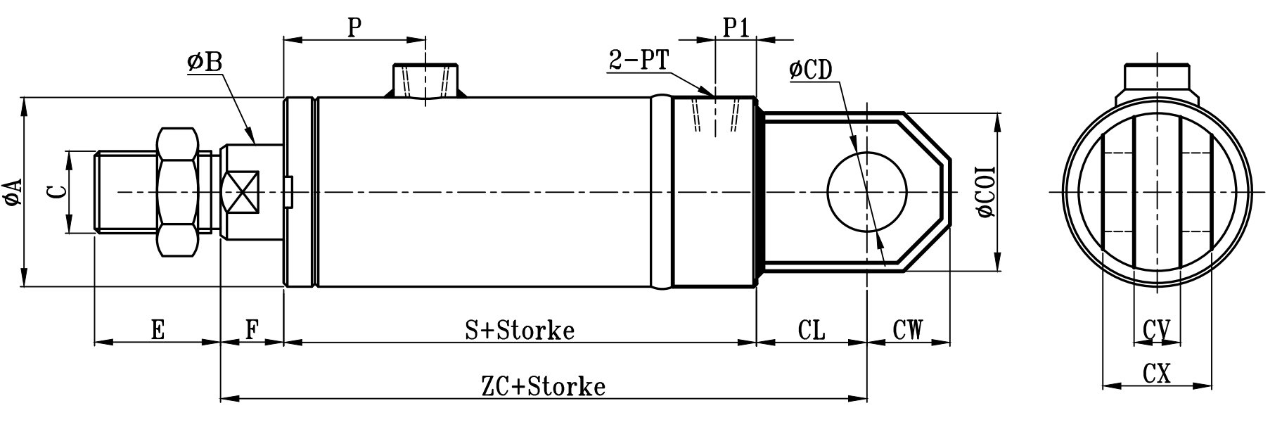 | 缸徑 BORE | ΦA(chǔ) | ΦB | C | E | F | P | P1 | PT | S | ZC | ΦCD | ΦCO | ΦCOI | CL | CW | CV | CX |