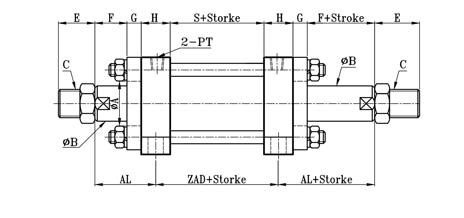 | 缸徑 BORE | ΦA(chǔ) | ΦB | C | E | F | G | H | N | PT | S | AL | ZA | ZAD | Z | ΦA(chǔ)D | AT | AH | AN | AX | AY |