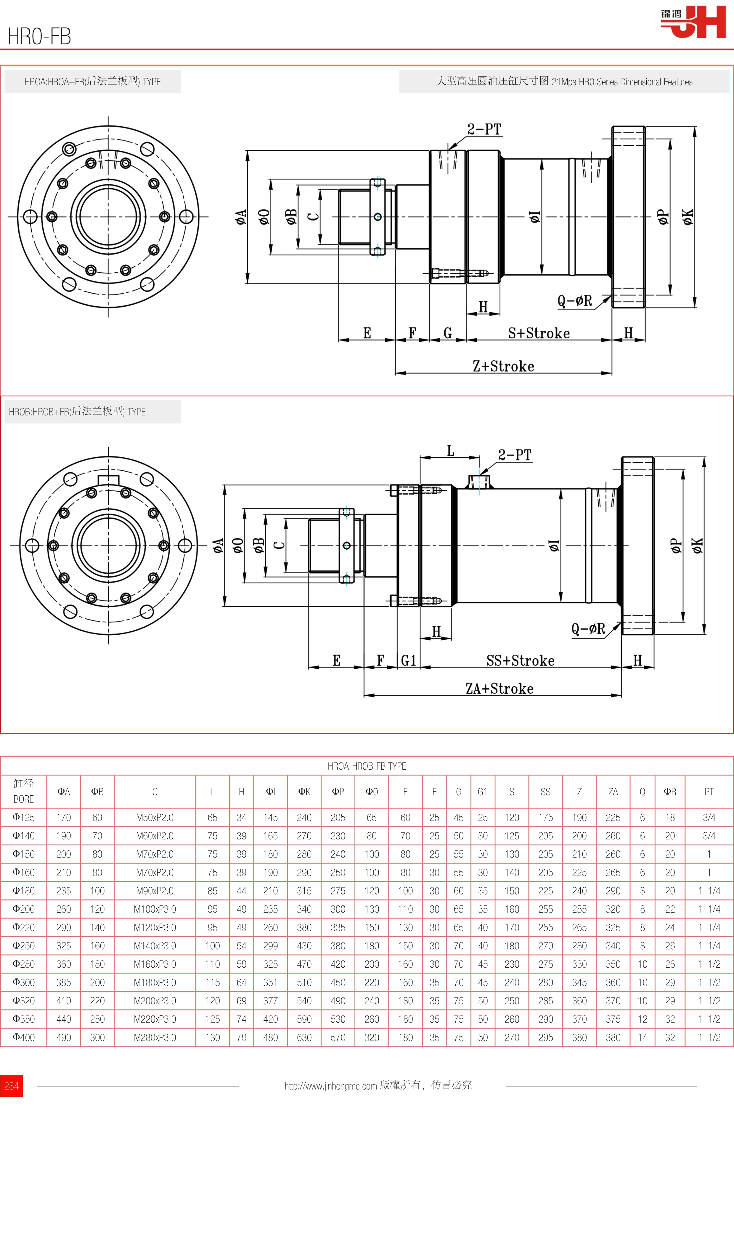 HROA:HROA+FB(后法蘭板型) TYPE | 大型高壓圓油壓缸尺寸圖 21Mpa HR0 Series Dimensional Features |