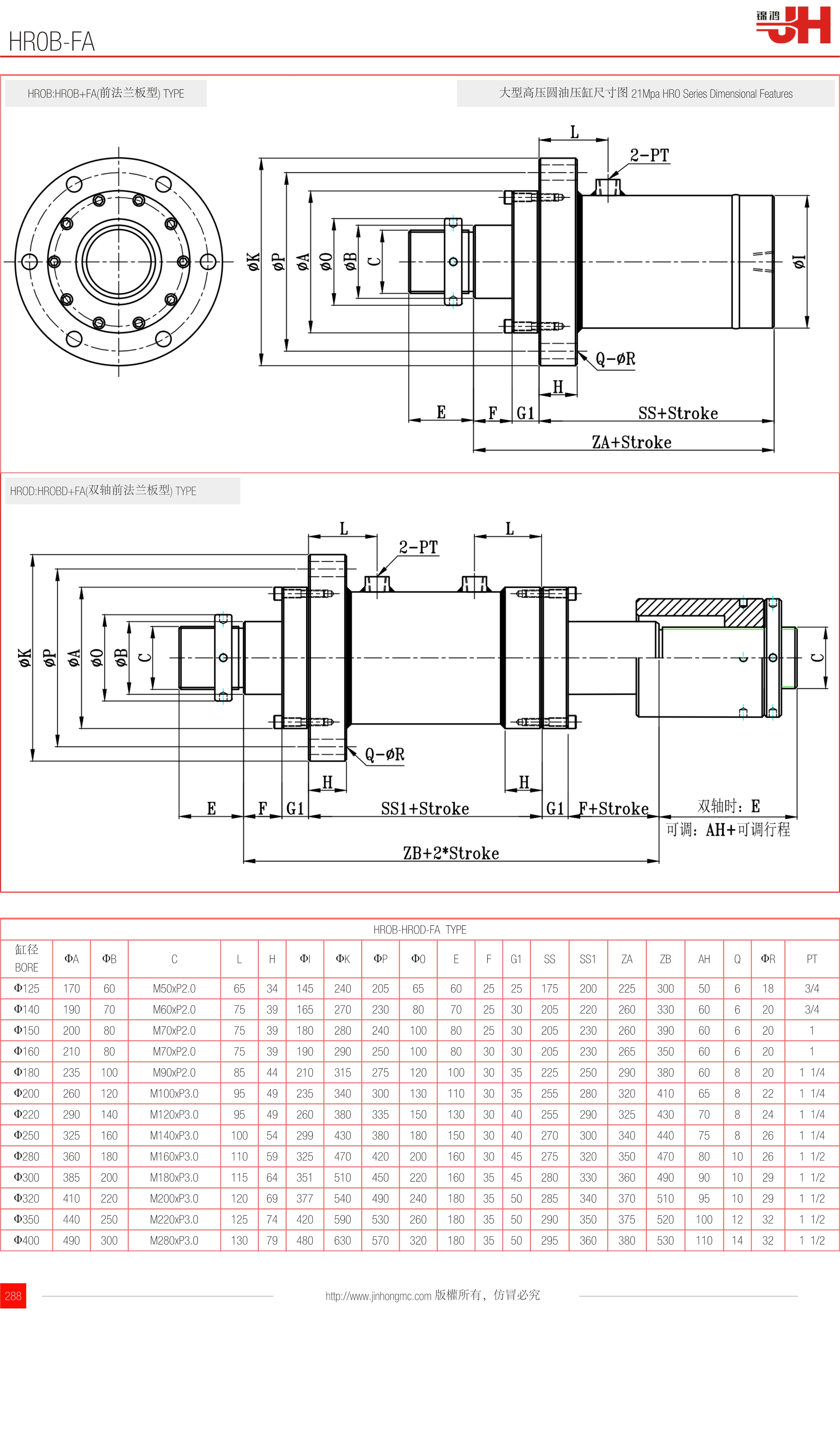 HROB:HROB+FA(前法蘭板型) TYPE | 大型高壓圓油壓缸尺寸圖 21Mpa HR0 Series Dimensional Features |
