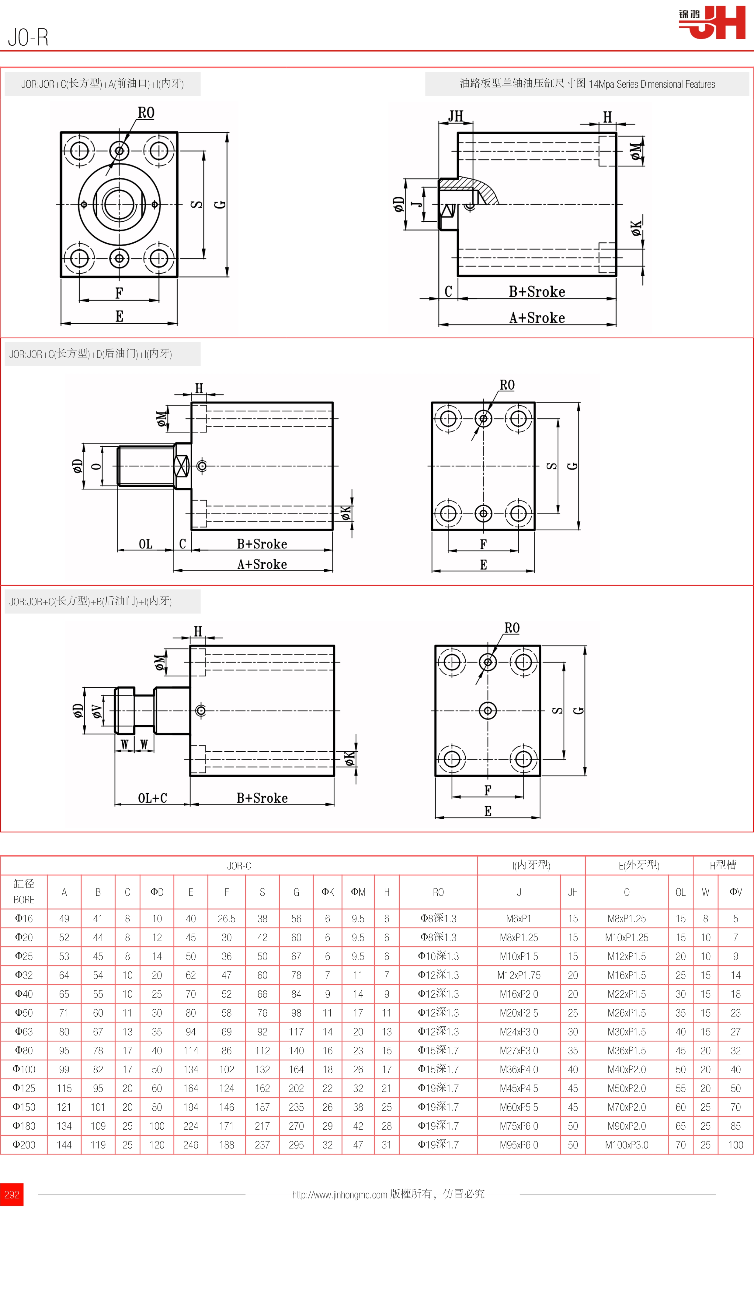 JOR:JOR+C(長方型)+A(前油口)+I(內牙) | 油路板型單軸油壓缸尺寸圖 14Mpa Series Dimensional Features |