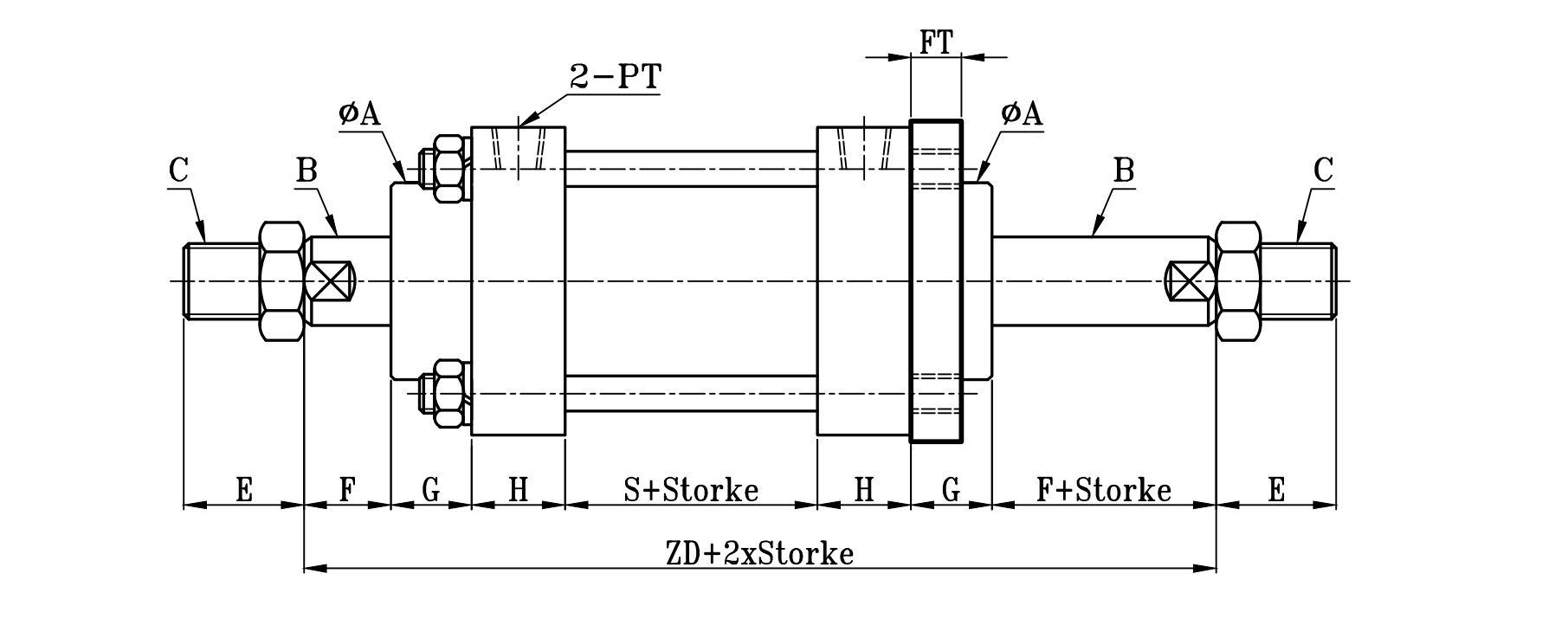 | 缸徑 BORE | ΦA | ΦB | C | E | F | G | H | PT | S | ZB | ZD | ΦFD | FT | FR | FX | FY | FZ |