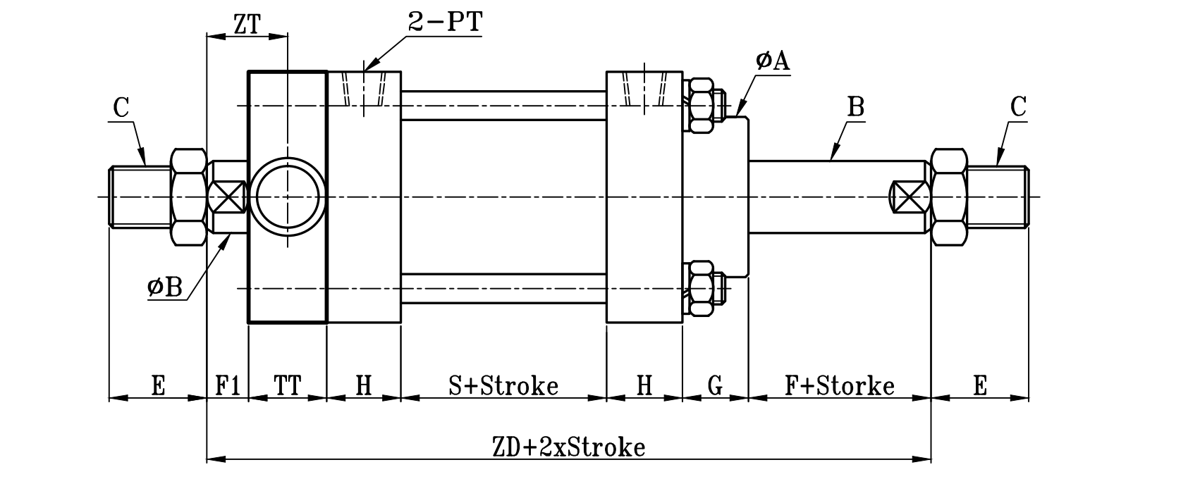 | 缸徑 BORE | ΦA | ΦB | C | E | F | F1 | G | H | PT | S | ZT | ZD | TL | TP | TT | ΦTU |