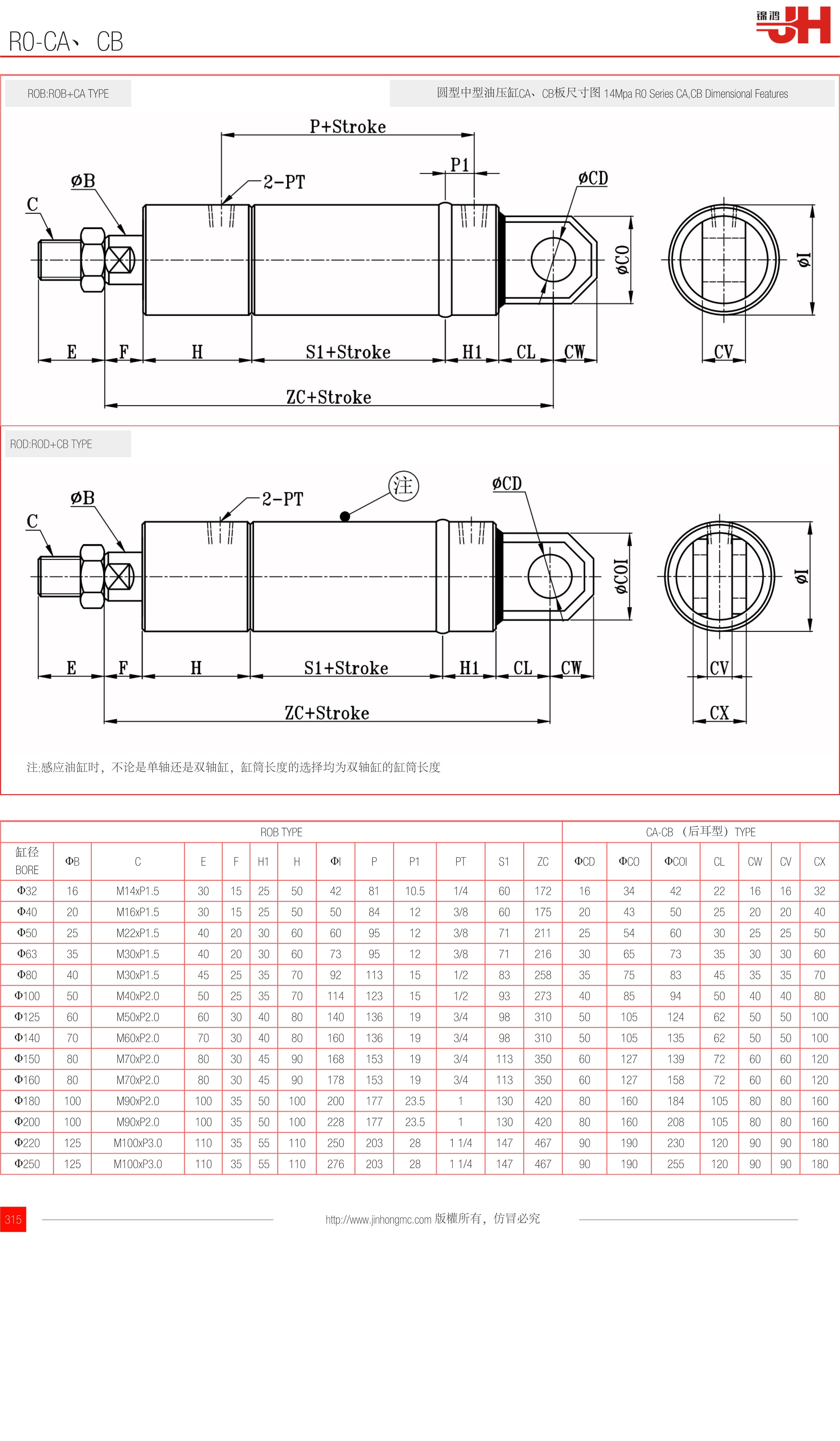 ROB:ROB+CA TYPE | 圓型中型油壓缸CA、CB板尺寸圖 14Mpa R0 Series CA,CB Dimensional Features |