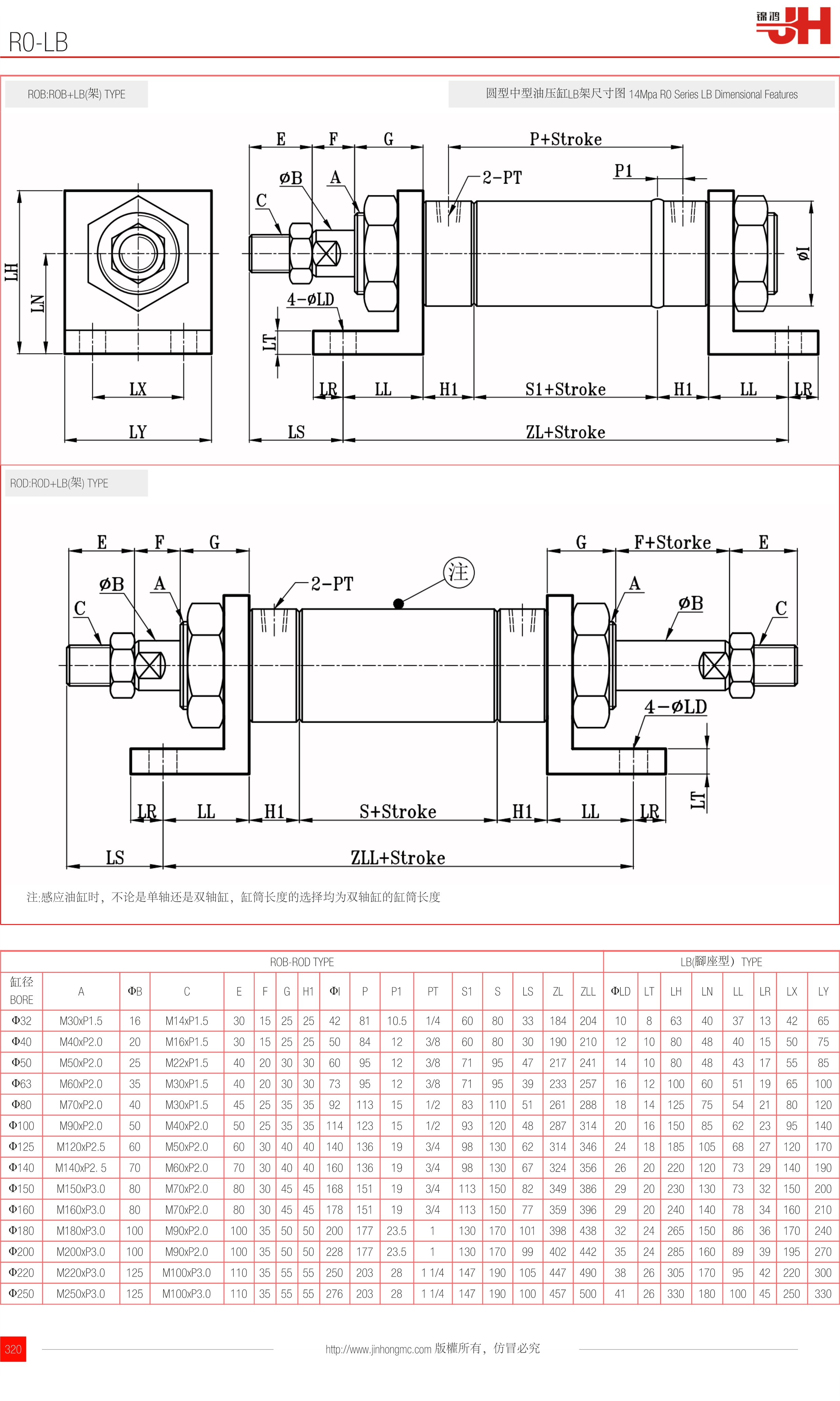 ROB:ROB+LB(架) TYPE | 圓型中型油壓缸LB架尺寸圖 14Mpa R0 Series LB Dimensional Features |