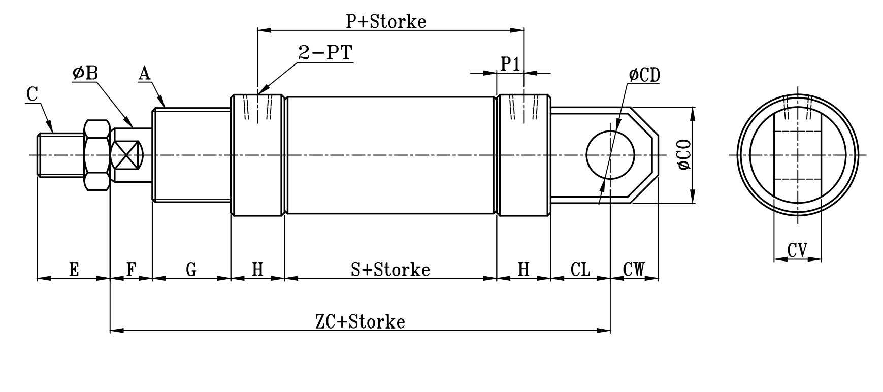 | 缸徑 BORE | A | ΦB | C | E | F | G | H | ΦI | P | P1 | PT | S | ZC | ΦCD | CL | CW | ΦCO | ΦCO1 | CV | CX |