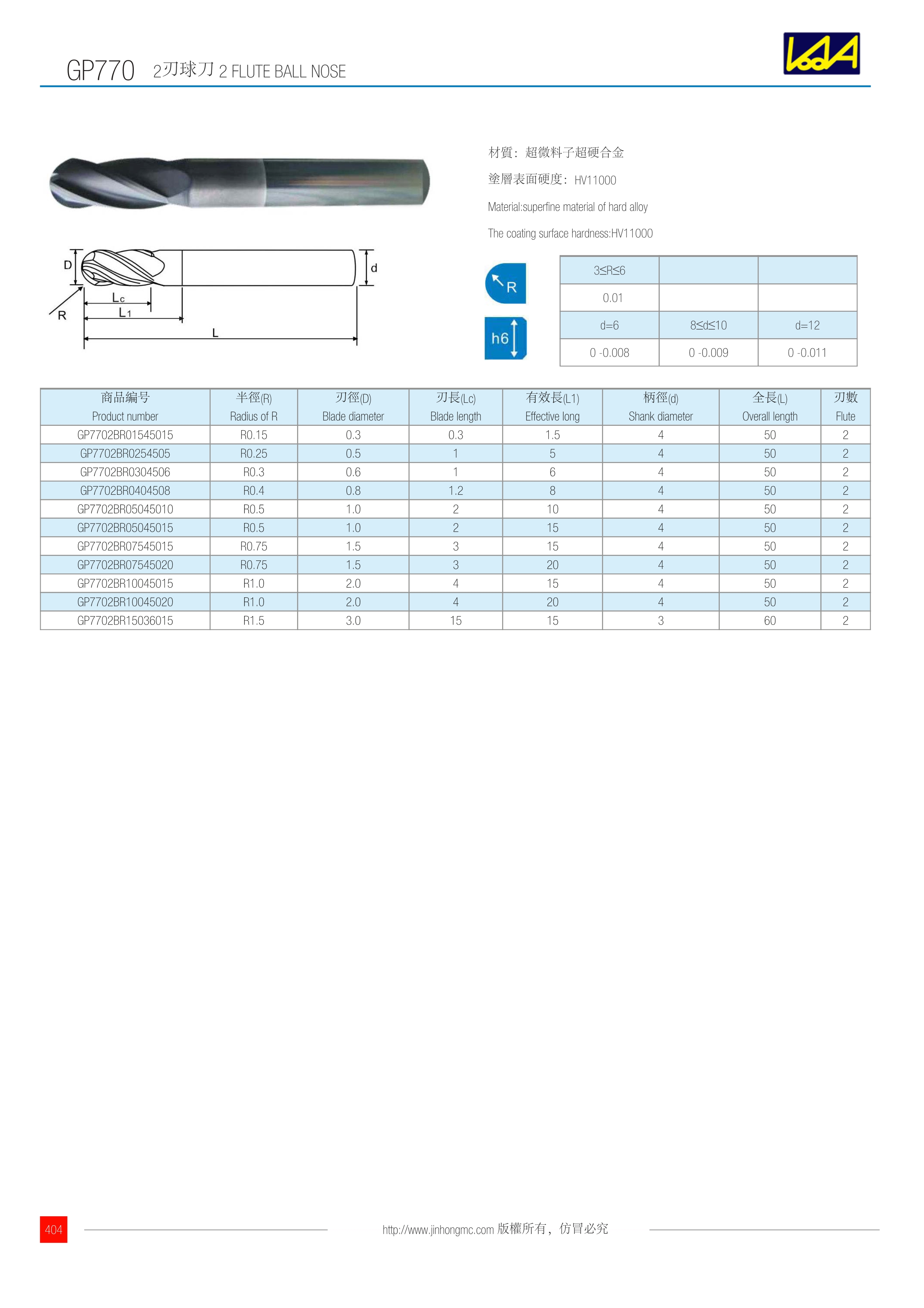 | 商品編號 Product number | 半徑(R) Radius of R | 刃徑(D) Blade diameter | 刃長(Lc) Blade length | 有效長(L1) Effective long | 柄徑(d) Shank diameter | 全長(L) Overall length | 刃數(shù) Flute |