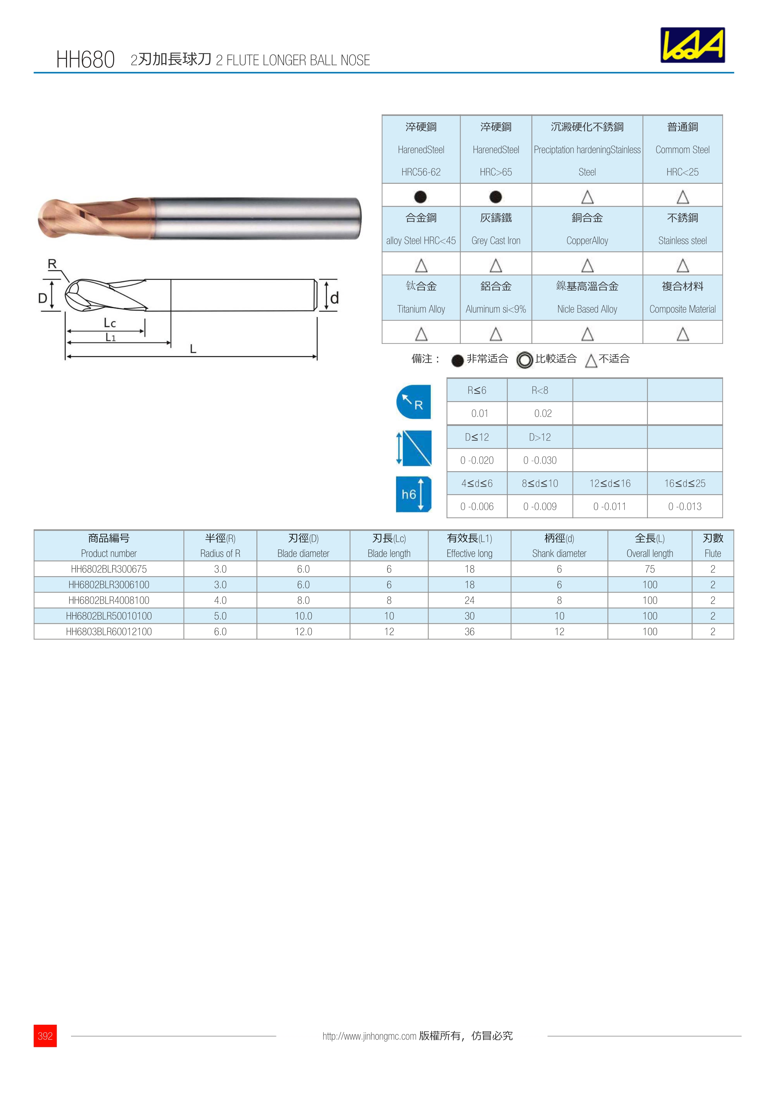 | 商品編號 Product number | 半徑(R) Radius of R | 刃徑(D) Blade diameter | 刃長(Lc) Blade length | 有效長(L1) Effective long | 柄徑(d) Shank diameter | 全長(L) Overall length | 刃數(shù) Flute |