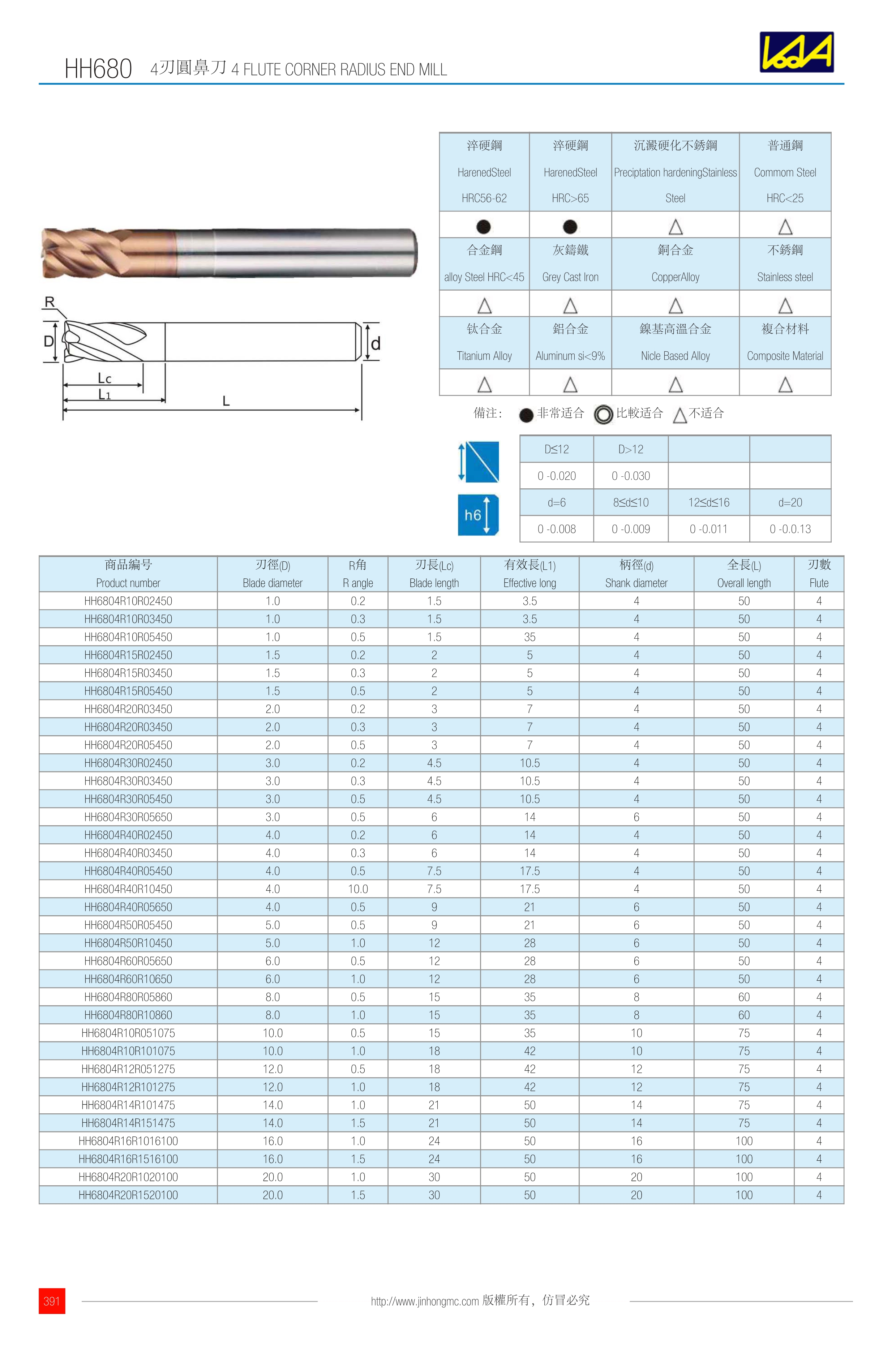 | 商品編號 Product number | 刃徑(D) Blade diameter | R角 R angle | 刃長(Lc) Blade length | 有效長(L1) Effective long | 柄徑(d) Shank diameter | 全長(L) Overall length | 刃數 Flute |