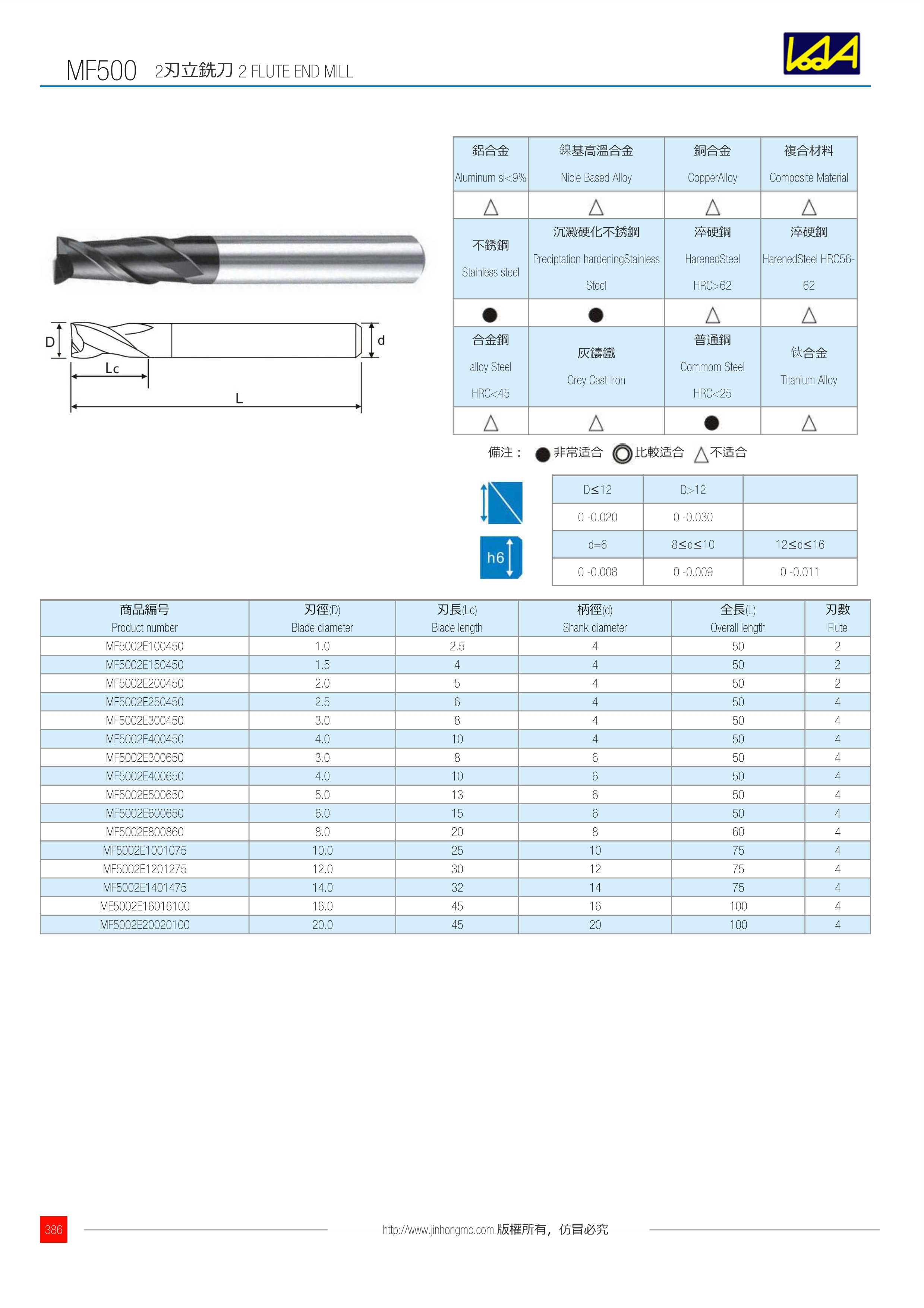 | 商品編號 Product number | 刃徑(D) Blade diameter | 刃長(Lc) Blade length | 柄徑(d) Shank diameter | 全長(L) Overall length | 刃數 Flute |