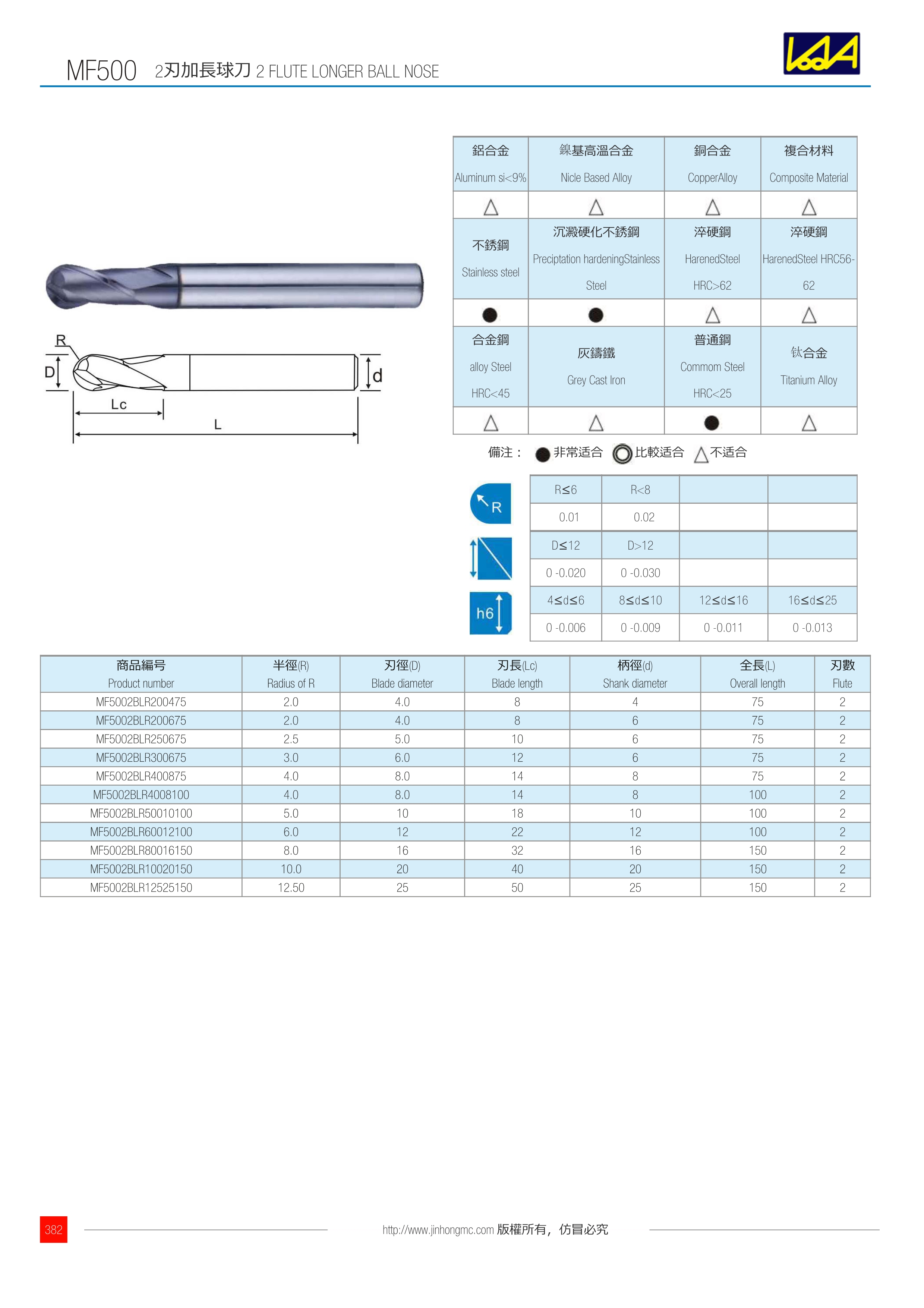 | 商品編號 Product number | 半徑(R) Radius of R | 刃徑(D) Blade diameter | 刃長(Lc) Blade length | 柄徑(d) Shank diameter | 全長(L) Overall length | 刃數 Flute |