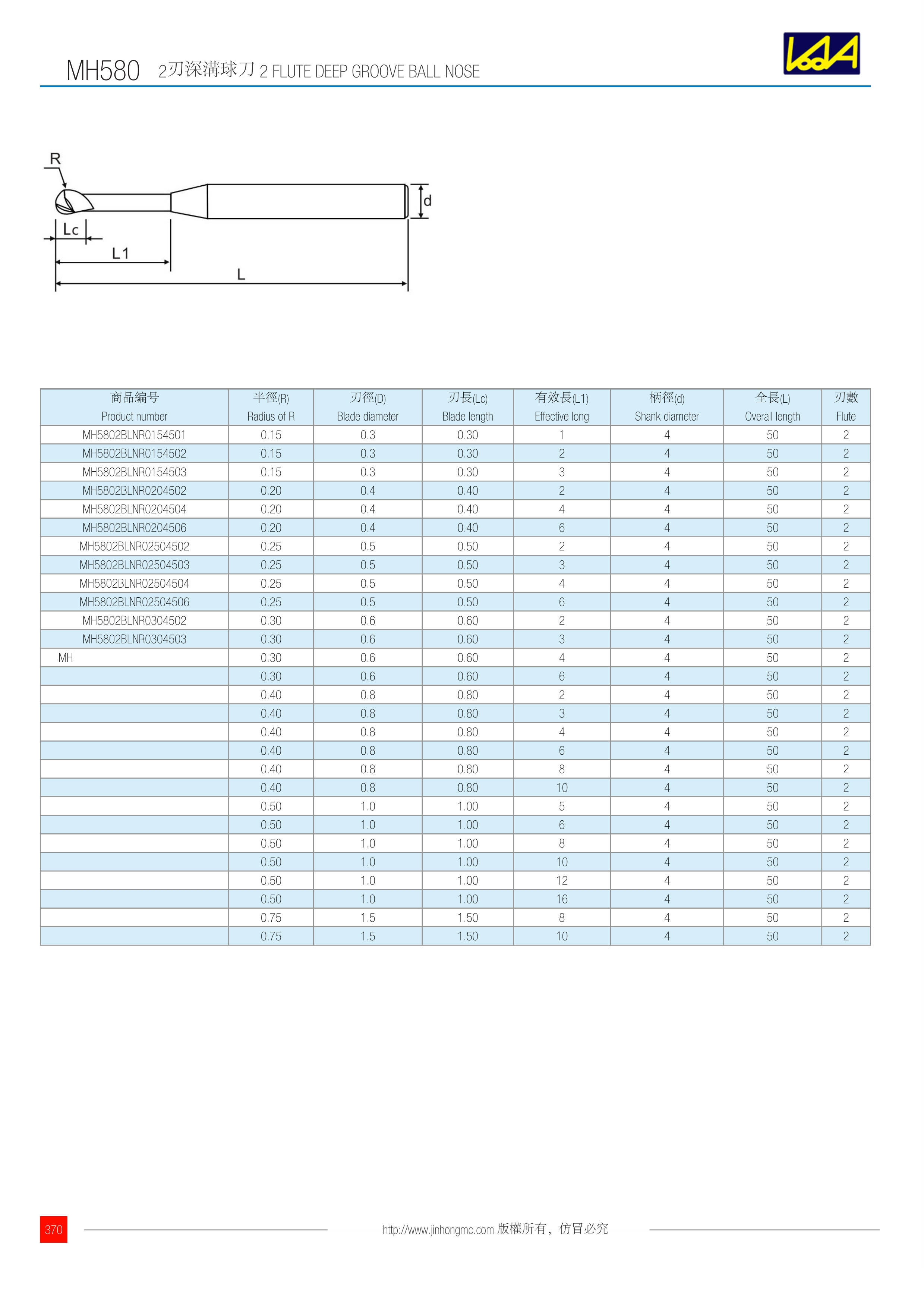 | 商品編號 Product number | 半徑(R) Radius of R | 刃徑(D) Blade diameter | 刃長(Lc) Blade length | 有效長(L1) Effective long | 柄徑(d) Shank diameter | 全長(L) Overall length | 刃數 Flute |